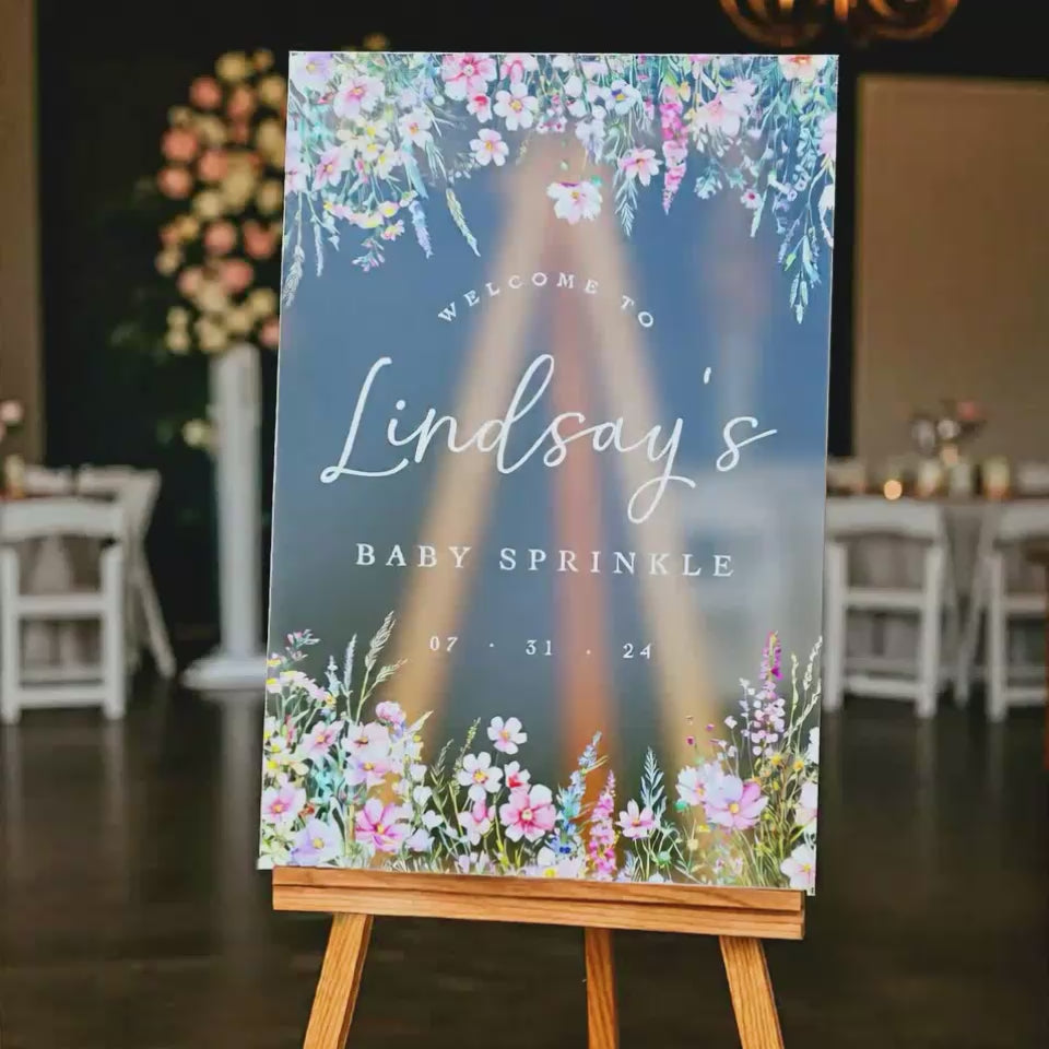 Elevate your baby shower decor with a customizable baby shower sign. Available in three premium material options: 3/8” PVC, 1/4” clear acrylic, and frosted acrylic. Perfect for adding charm to your special day!