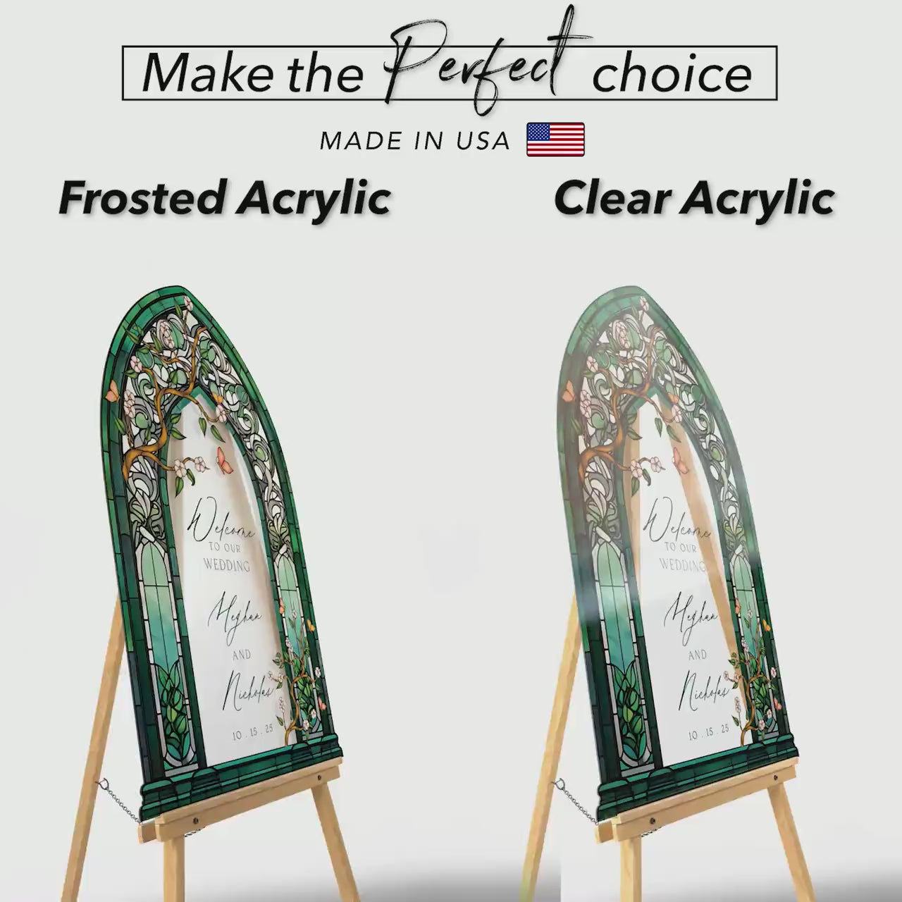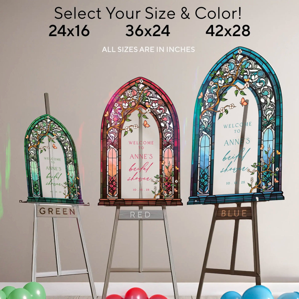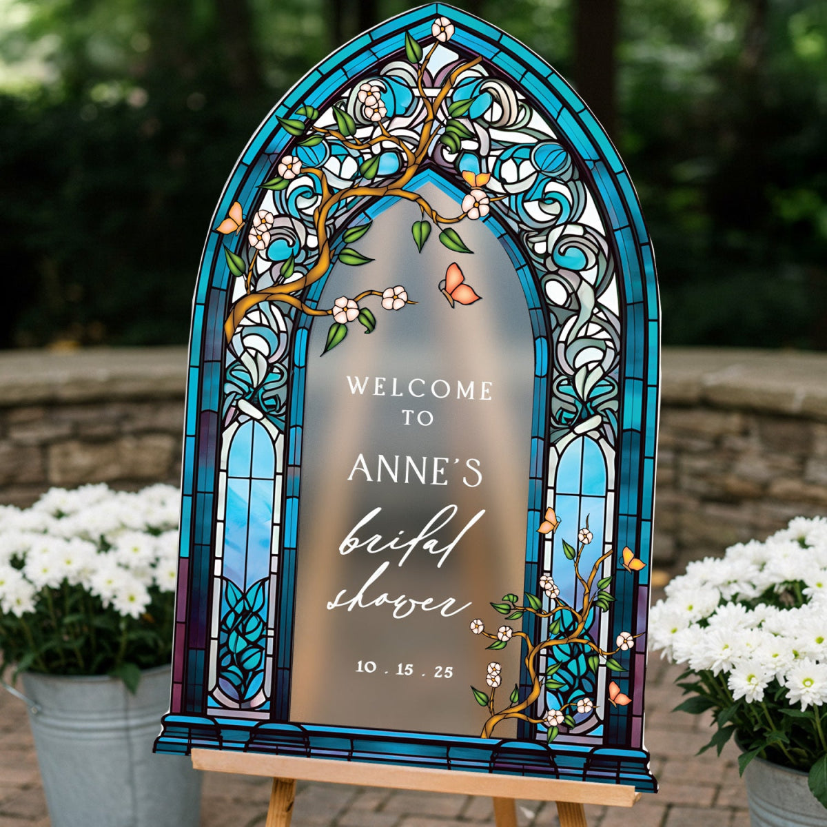 Elevate your bridal shower decor with a customizable stained glass wedding sign. Available in four premium material options: 3/8” PVC, 1/4” clear acrylic, frosted acrylic, and acrylic mirror. Perfect for adding charm to your special day!