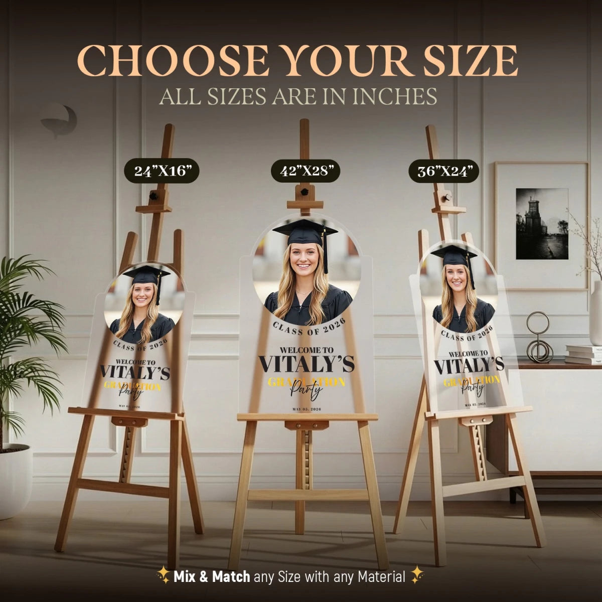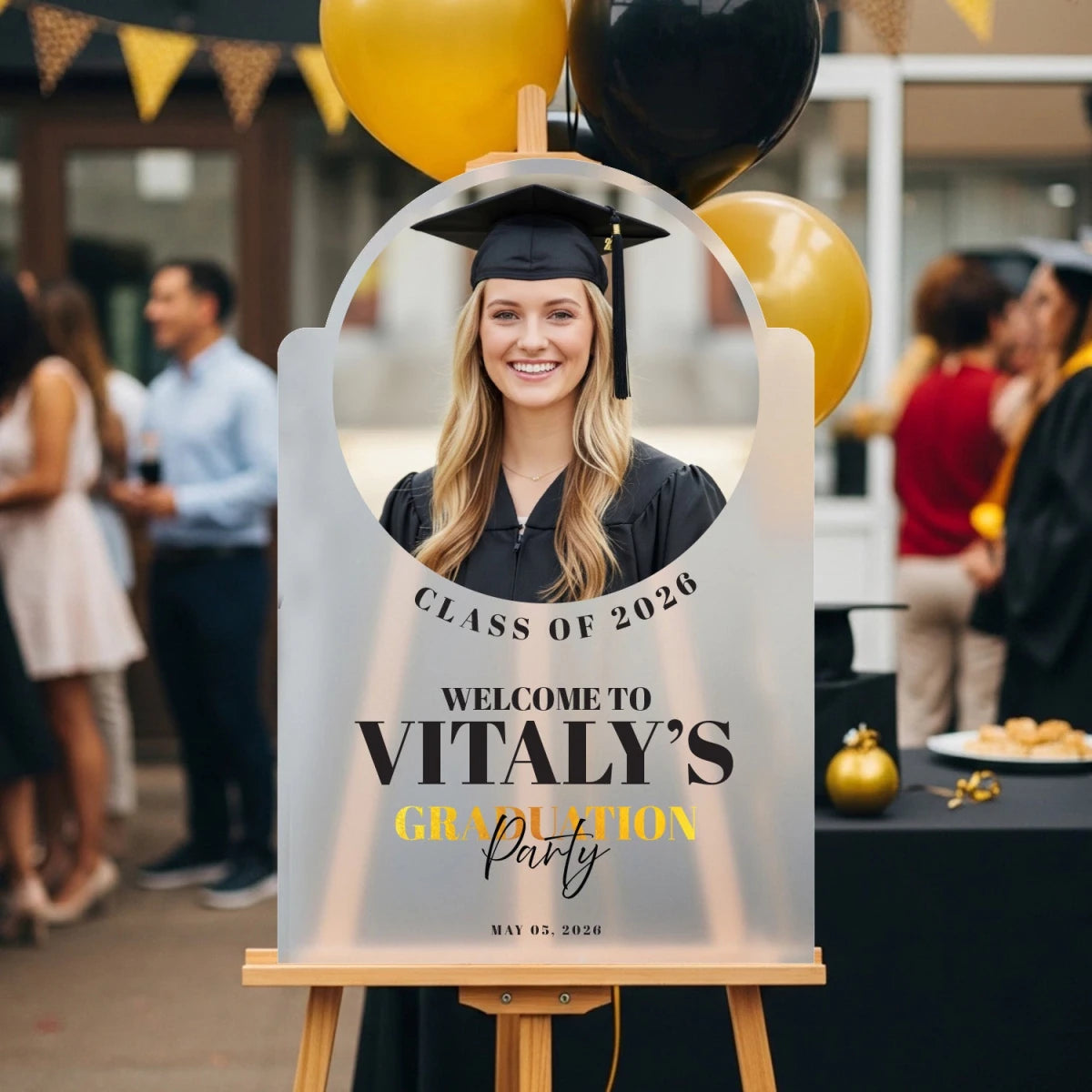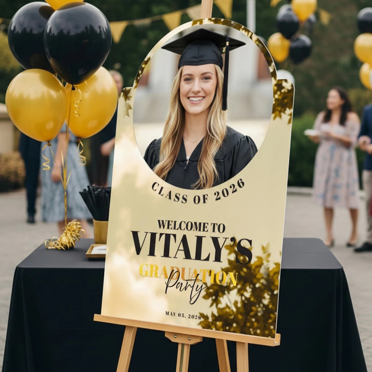 Elevate your graduation decor with a customizable stained glass wedding sign. Available in four premium material options: 3/8” PVC, 1/4” clear acrylic, frosted acrylic, and acrylic mirror. Perfect for adding charm to your special day!