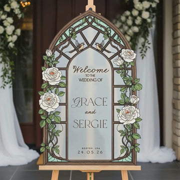 Elevate your wedding decor with a customizable stained glass wedding sign. Available in four premium material options: 3/8β PVC, 1/4β clear acrylic, frosted acrylic, and acrylic mirror. Perfect for adding charm to your special day!