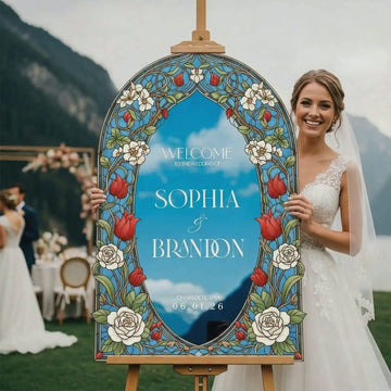 Elevate your wedding decor with a customizable stained glass wedding sign. Available in four premium material options: 3/8β PVC, 1/4β clear acrylic, frosted acrylic, and acrylic mirror. Perfect for adding charm to your special day!