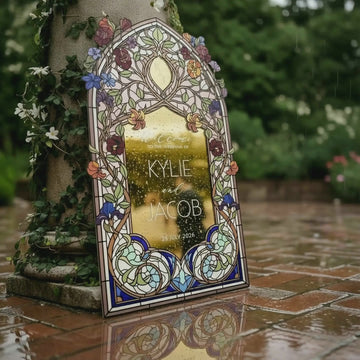 Elevate your wedding decor with a customizable stained glass wedding sign. Available in four premium material options: 3/8” PVC, 1/4” clear acrylic, frosted acrylic, and acrylic mirror. Perfect for adding charm to your special day!