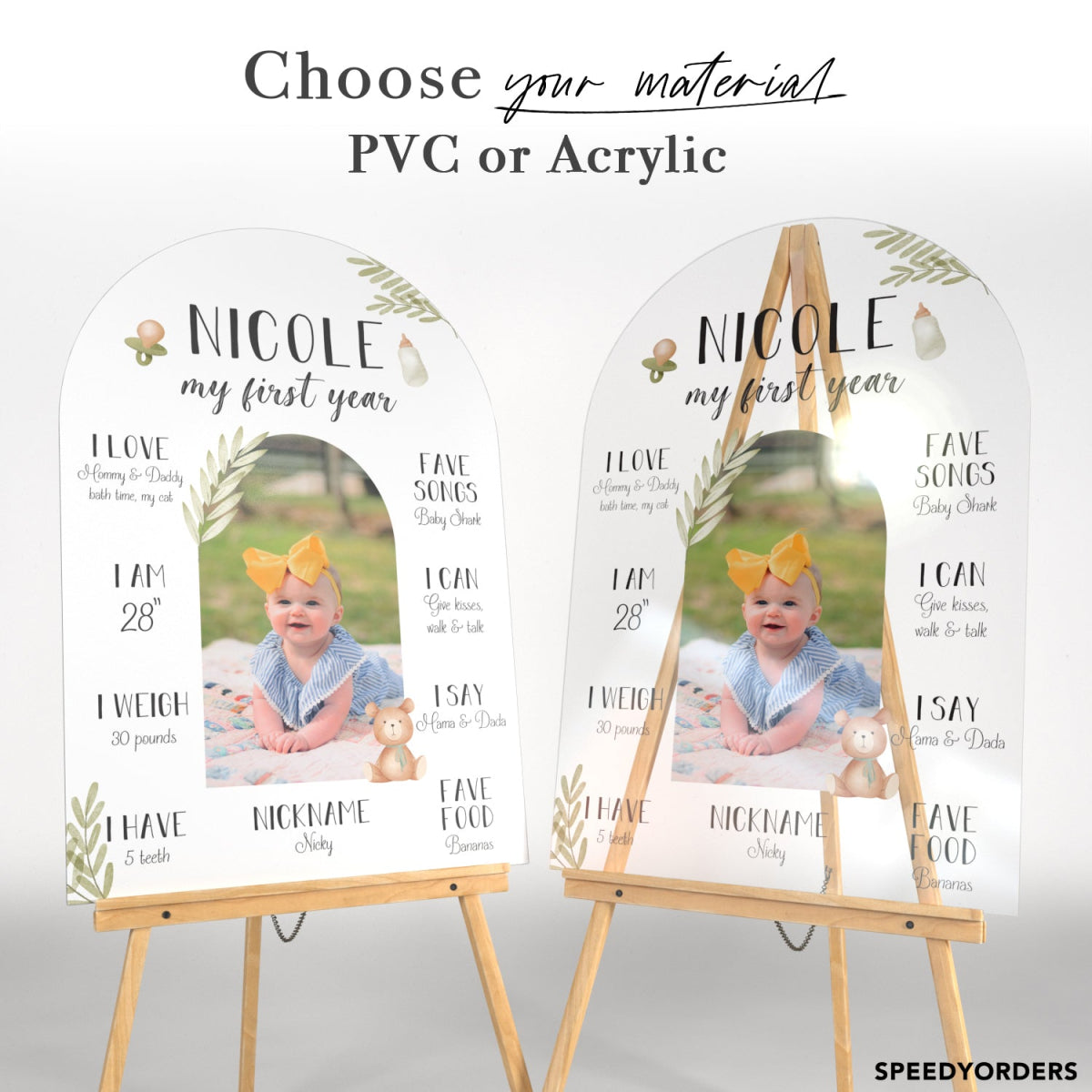 Our custom signs are available in acrylic (clear and frosted), mirrors, papers, and PVC (print board). Photobooth frames are typically made from PVC or paper.