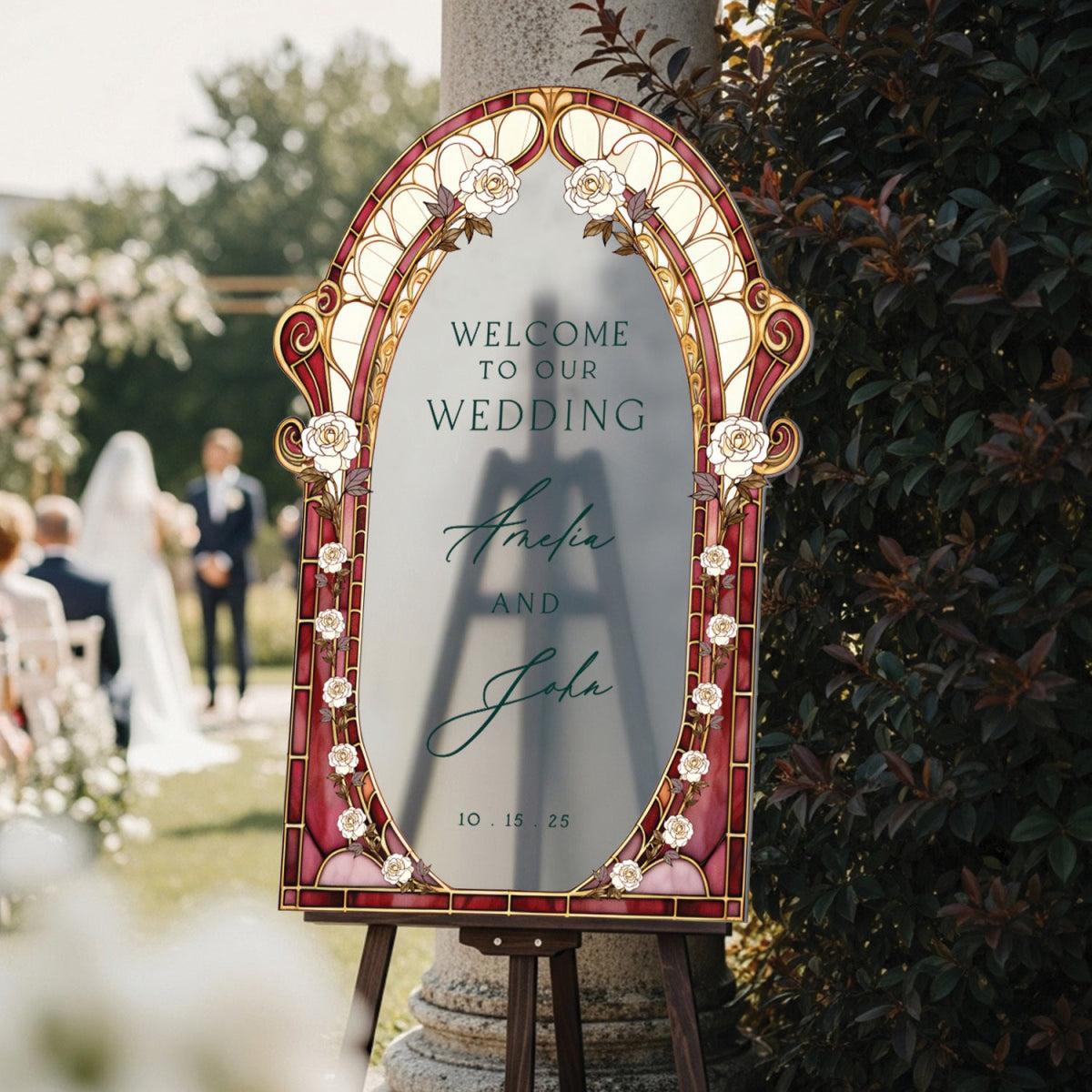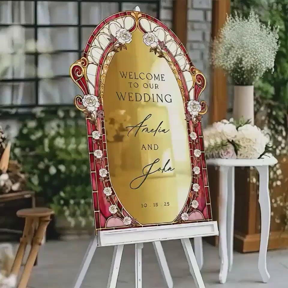 Elevate your wedding decor with a customizable stained glass wedding sign. Available in four premium material options: 3/8” PVC, 1/4” clear acrylic, frosted acrylic, and acrylic mirror. Perfect for adding charm to your special day!