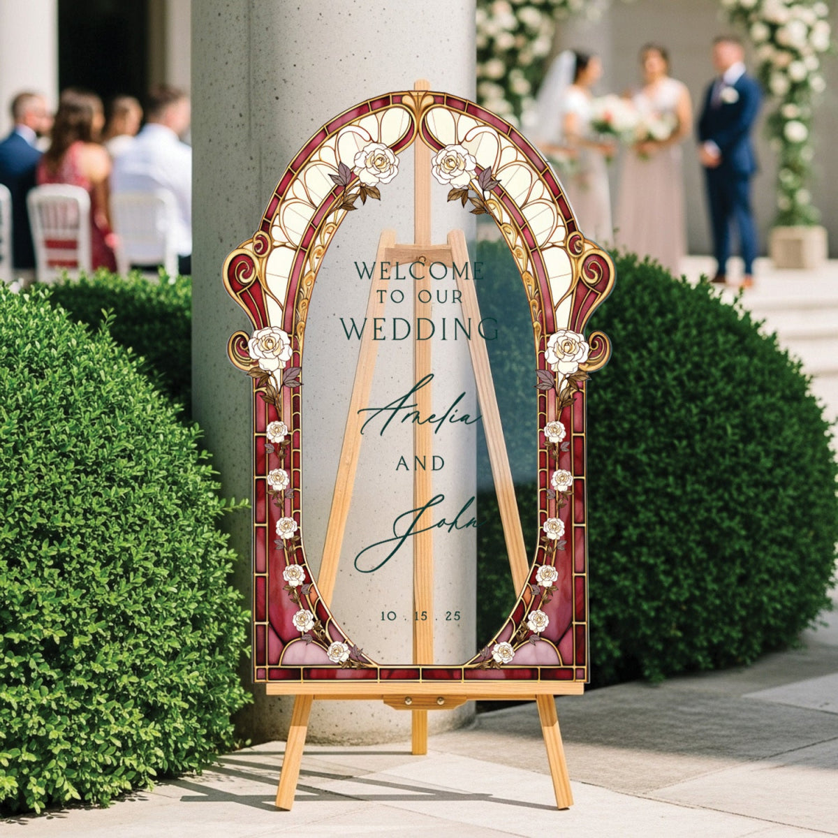 Burgundy Red Stained Glass Floral Wedding Sign, Cream Roses Frosted Wedding Welcome Sign