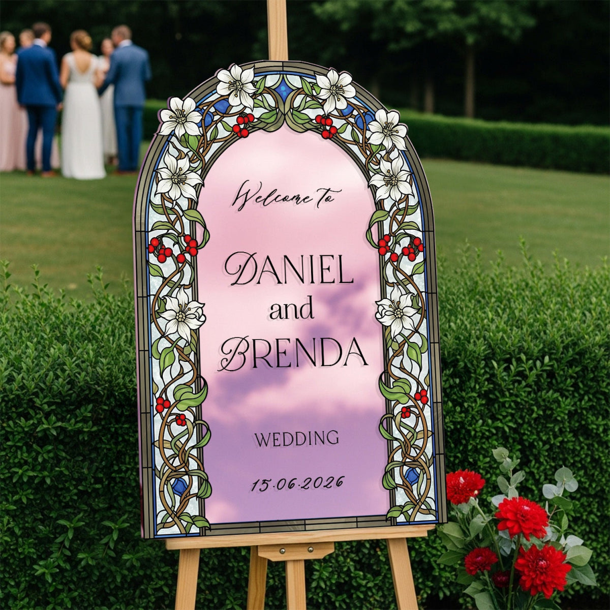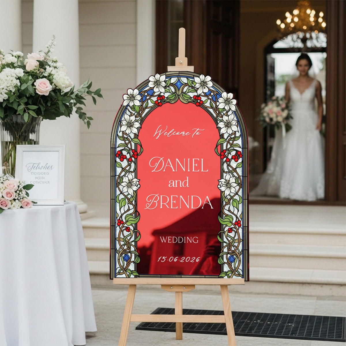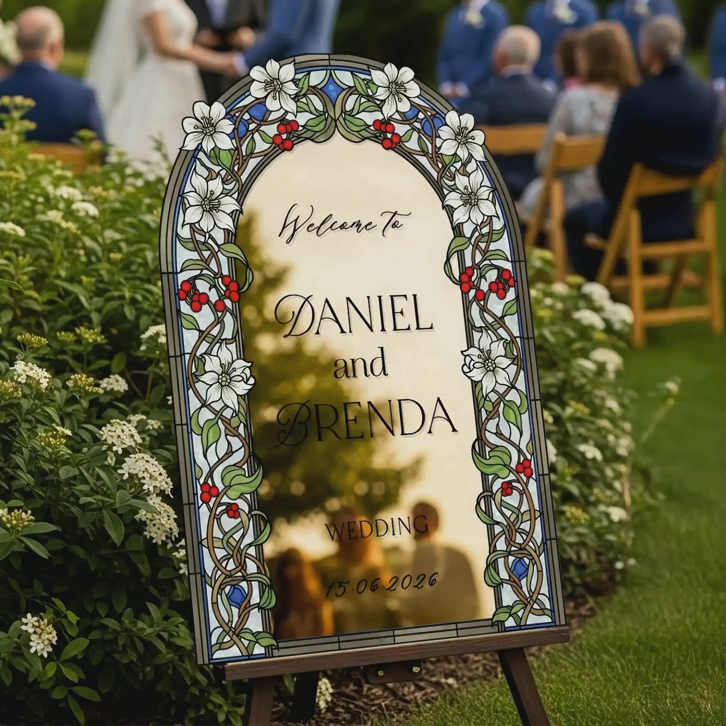 Elevate your wedding decor with a customizable stained glass wedding sign. Available in four premium material options: 3/8” PVC, 1/4” clear acrylic, frosted acrylic, and acrylic mirror. Perfect for adding charm to your special day!