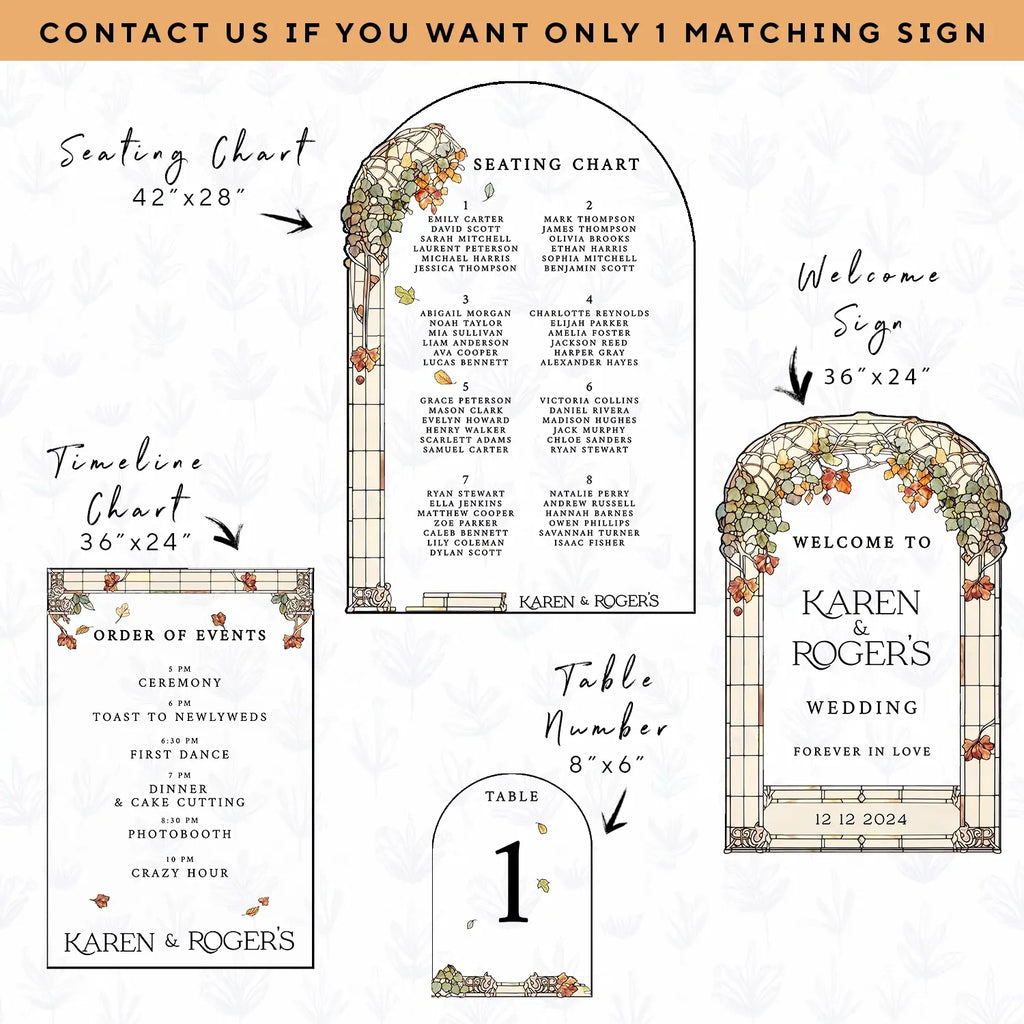 Forever In Love Wedding Bundle Set, Stained Glass Floral Wedding Sign Bundle, Seating Chart, Order Of Events and Table Signs