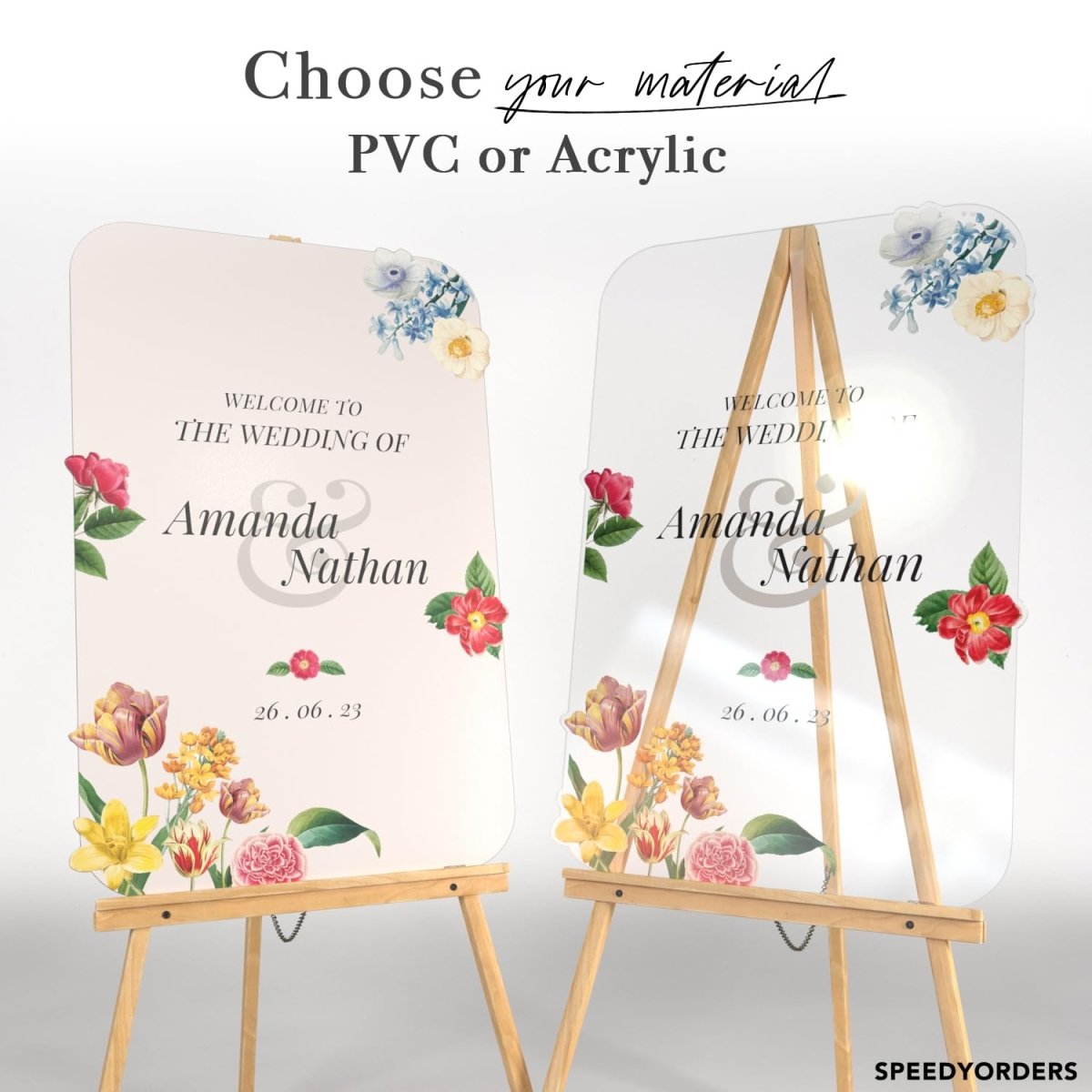 Our custom signs are available in acrylic (clear and frosted), mirrors, papers, and PVC (print board). Photobooth frames are typically made from PVC or paper.
