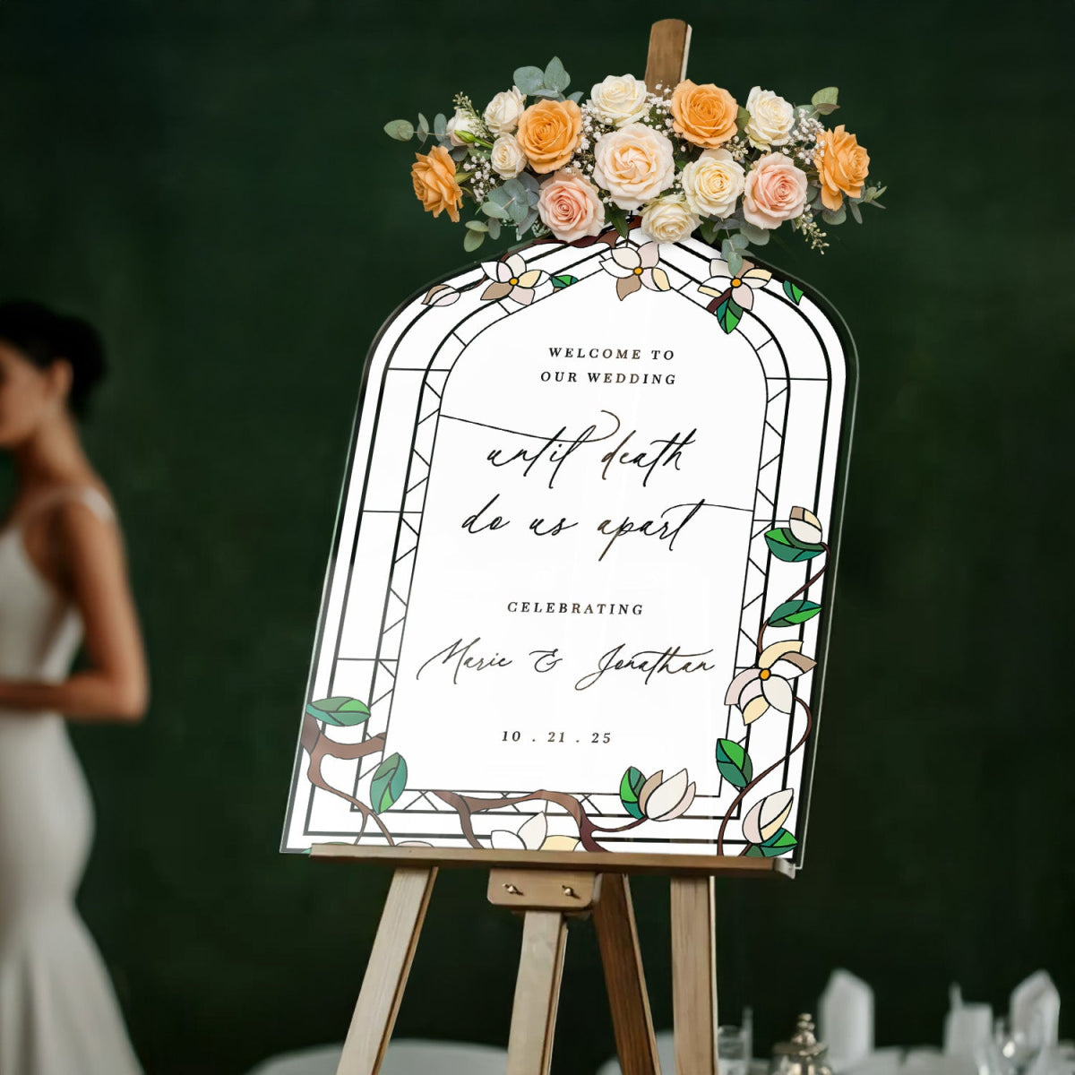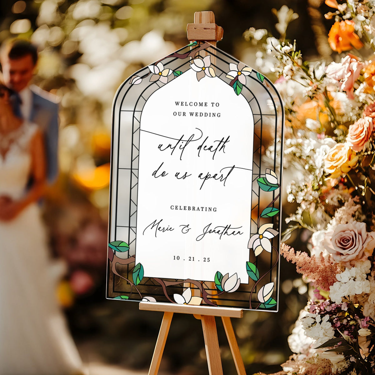 Elevate your wedding decor with a customizable stained glass wedding sign. Available in four premium material options: 3/8β PVC, 1/4β clear acrylic, frosted acrylic, and acrylic mirror. Perfect for adding charm to your special day!