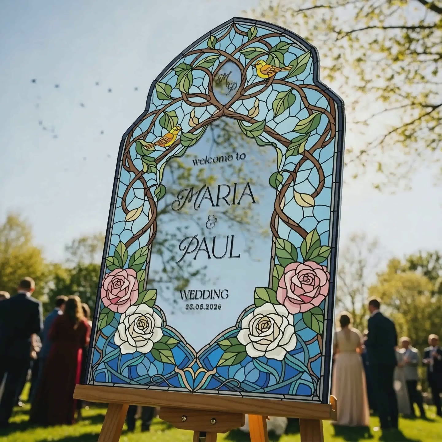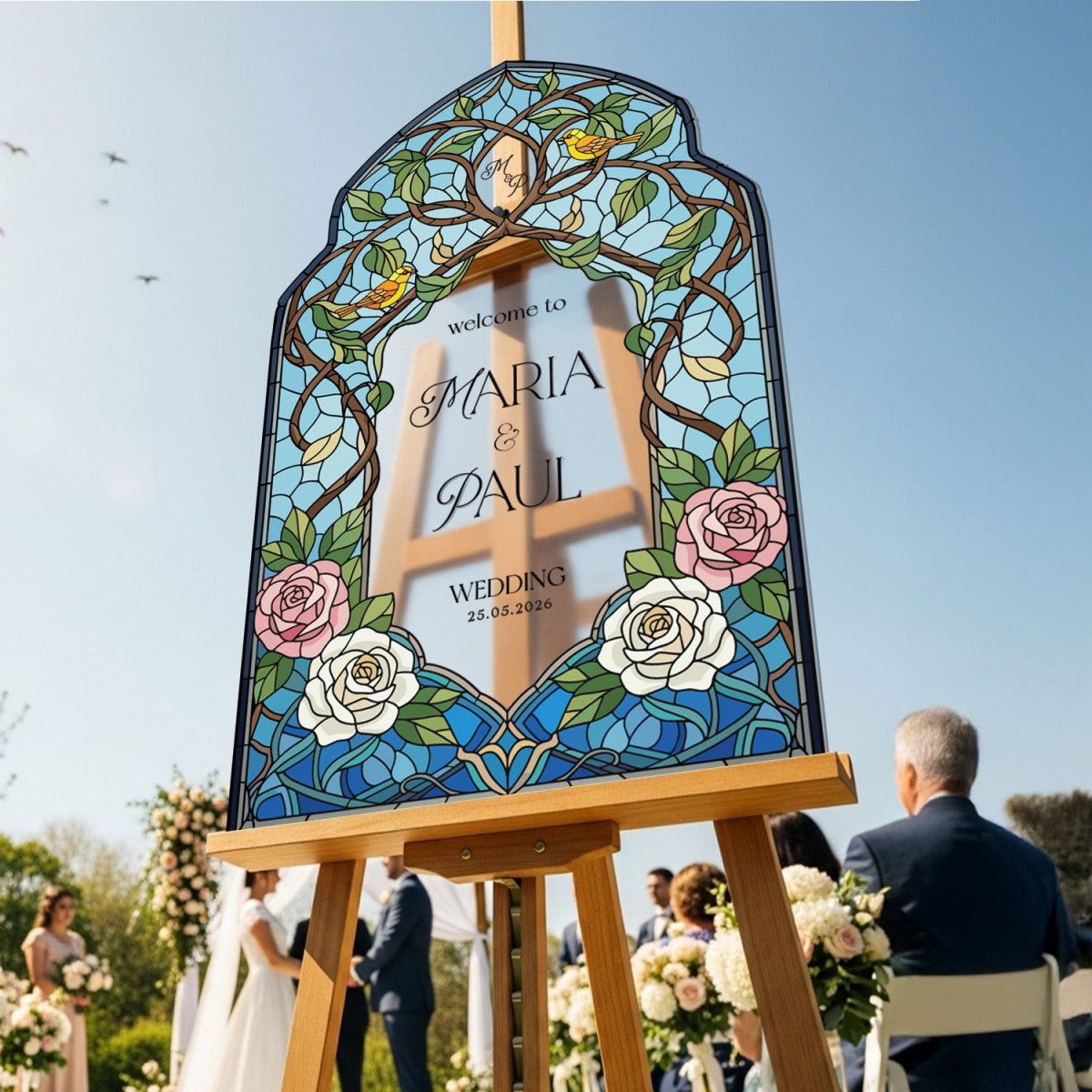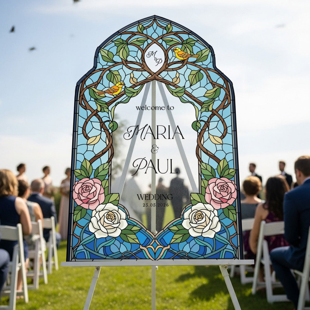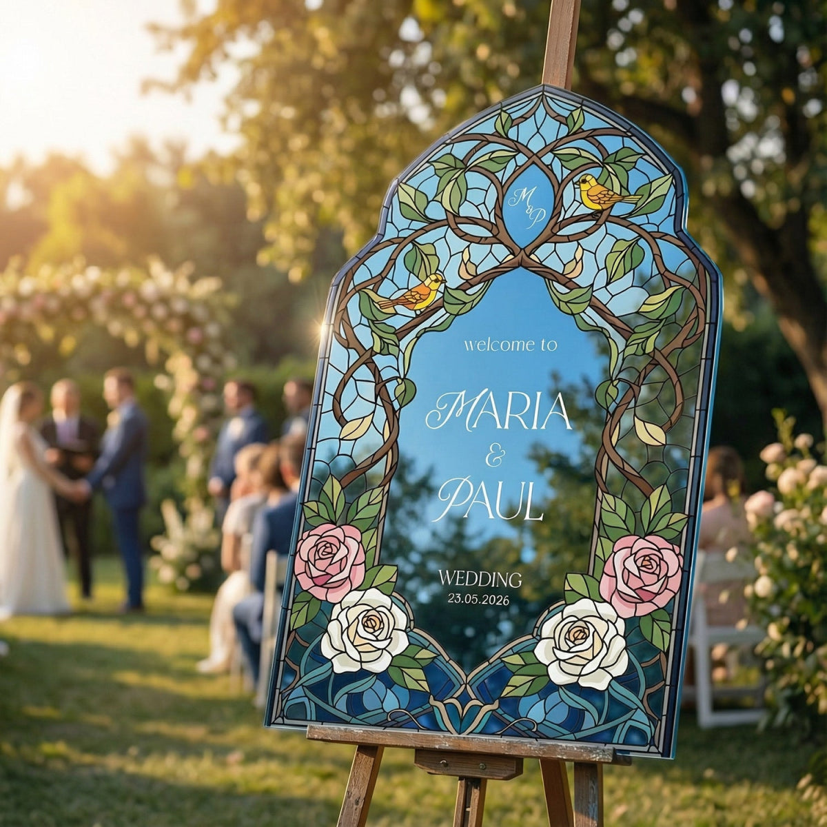 Elevate your wedding decor with a customizable stained glass wedding sign. Available in four premium material options: 3/8” PVC, 1/4” clear acrylic, frosted acrylic, and acrylic mirror. Perfect for adding charm to your special day!
