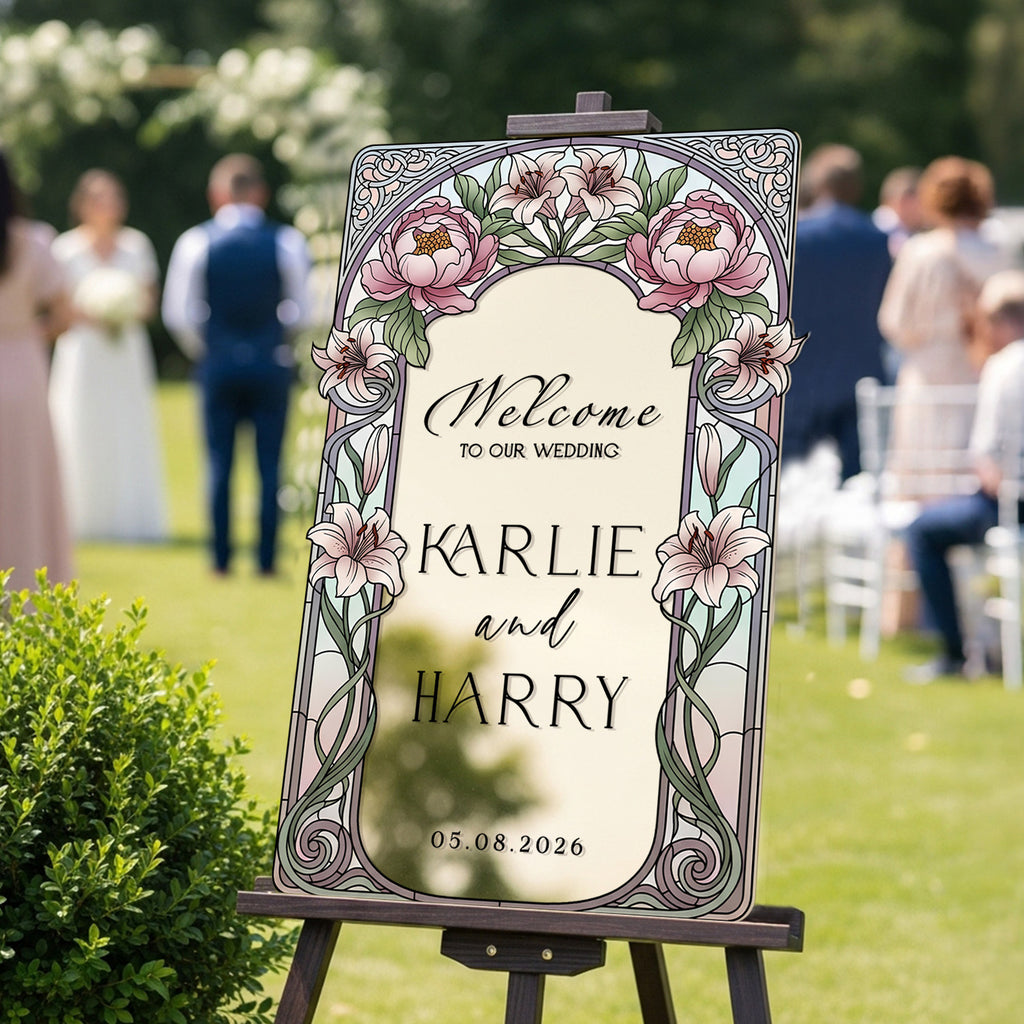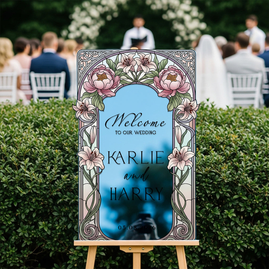 Stained Glass Wedding Sign, Pink Floral Mirror Wedding Welcome Sign